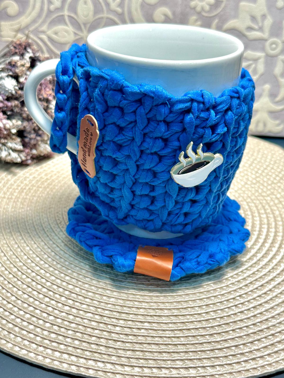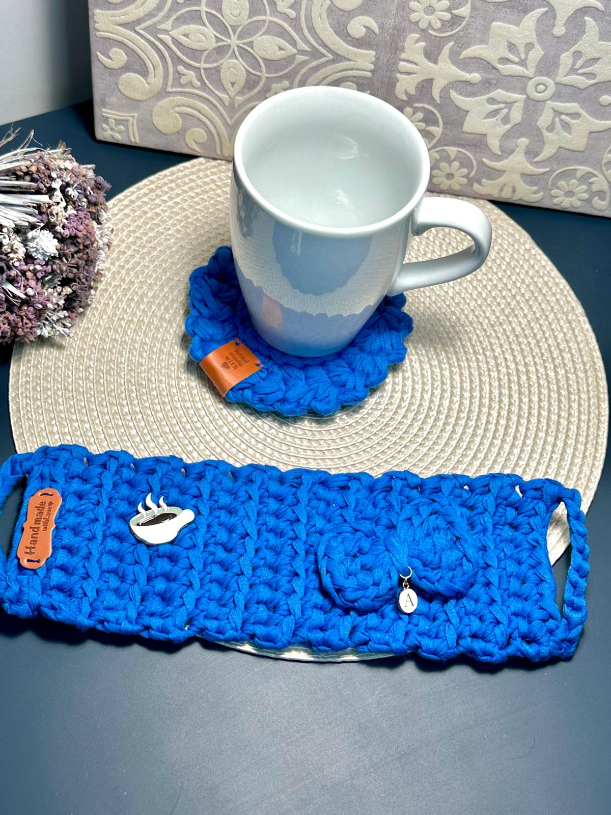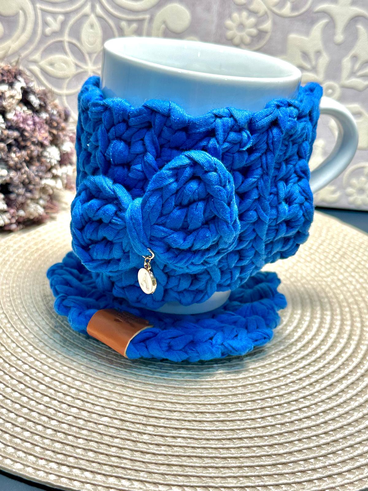 • Conjunto artesanal em crochê azul com porta-copo e porta-caneca com etiquetas e pendentes, sobre base redonda de corda