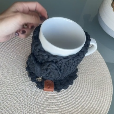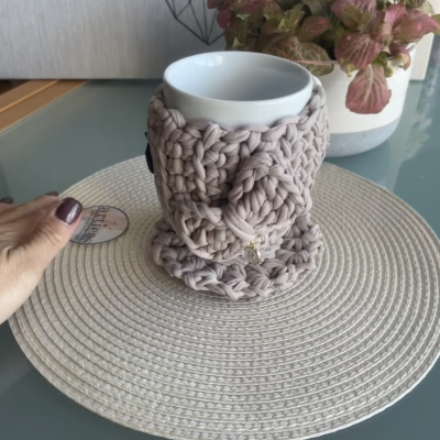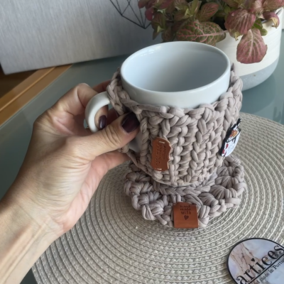 • Caneca branca com capa de crochê bege sobre descanso de copos redondo bege