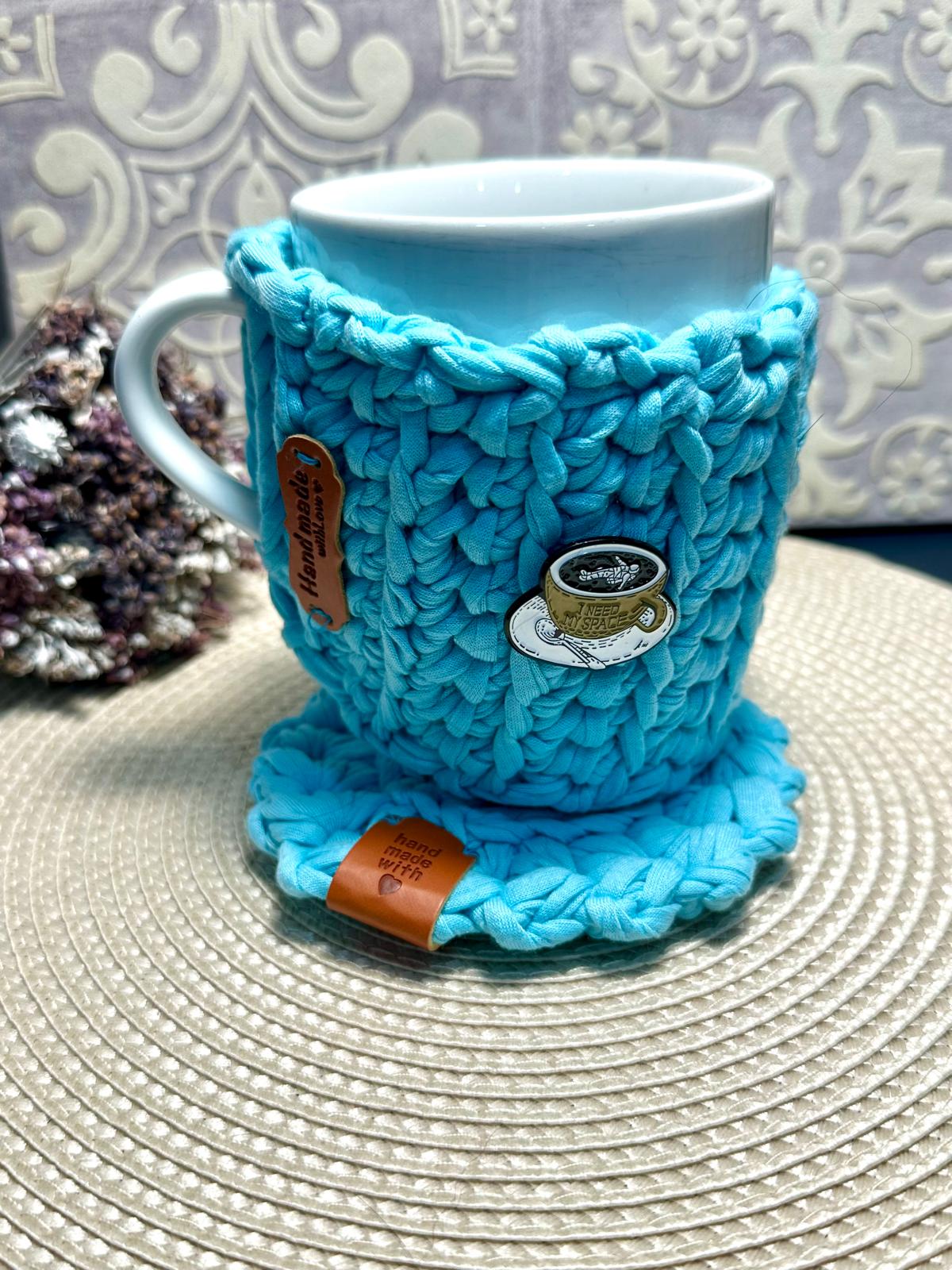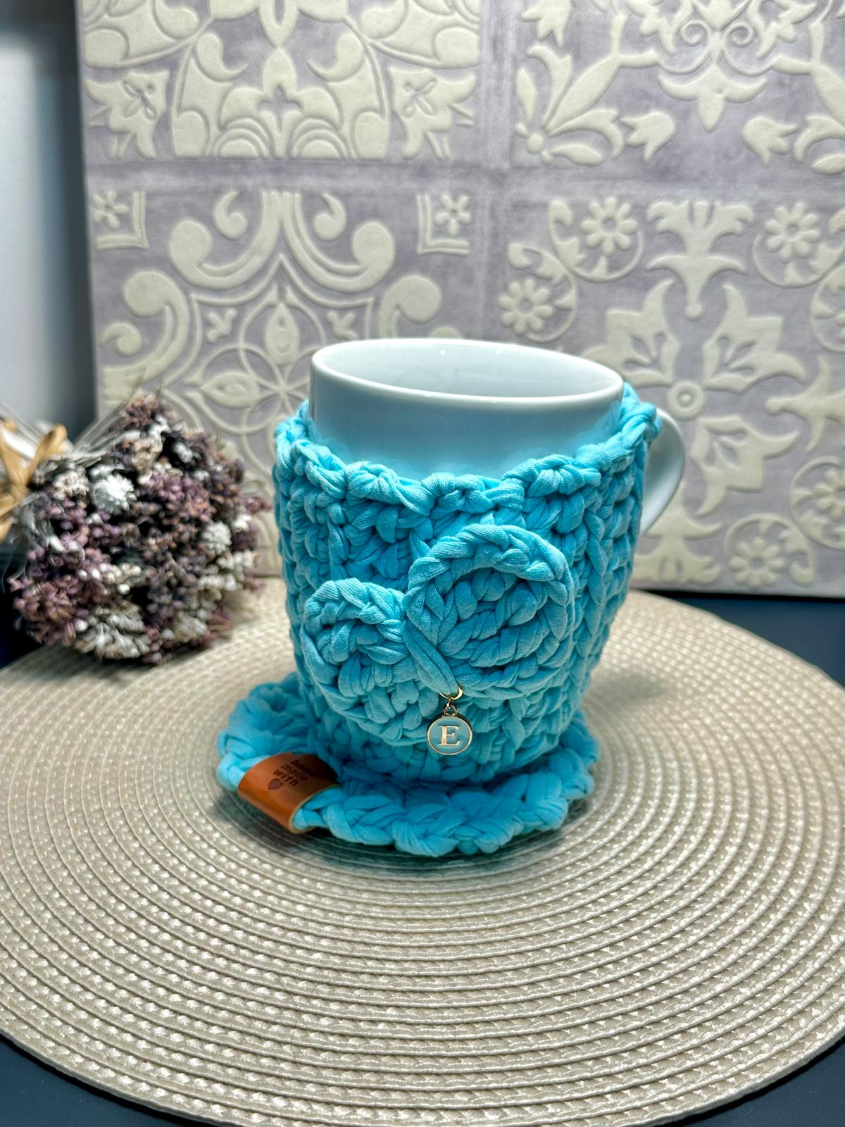 • Caneca branca com capa em tricô azul turquesa e base redonda