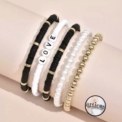 • Conjunto de cinco pulseiras com contas pretas, brancas, douradas e a palavra LOVE.