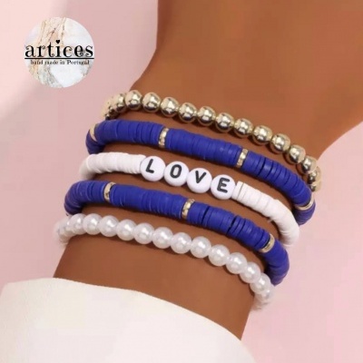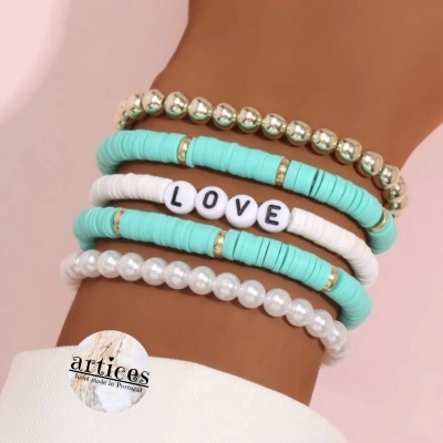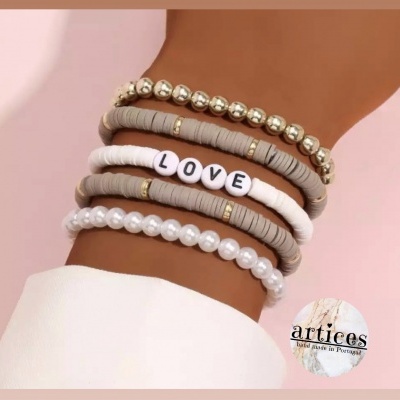 • Conjunto de pulseiras com letras LOVE e contas em tons bege e branco