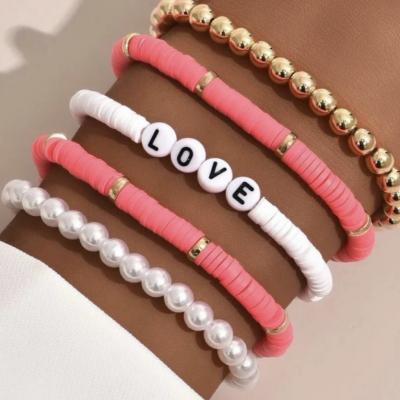 • Conjunto de pulseiras coloridas dourado, branco e rosa com letras LOVE