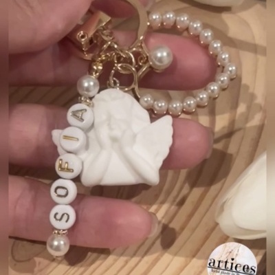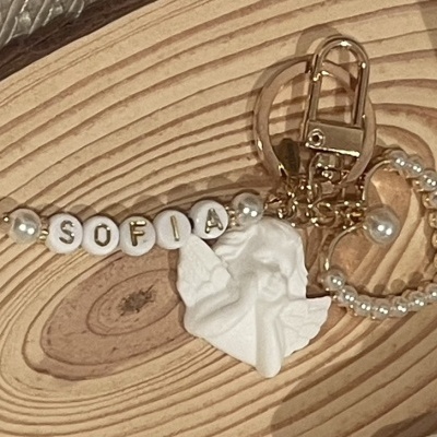 • Porta-chaves com anjo branco, pérolas falsas e letras SOFIA em fundo de madeira.