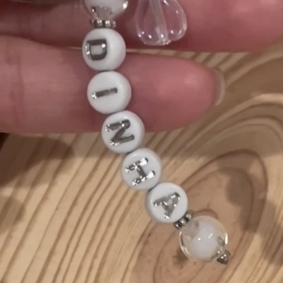 • Pulseira de contas brancas com a palavra Dinha em letras pretas