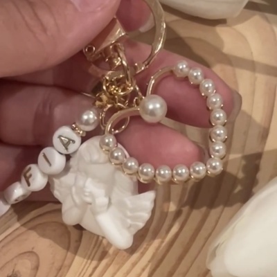 • Chaveiro branco com contas, anjo e pérolas sobre madeira clara