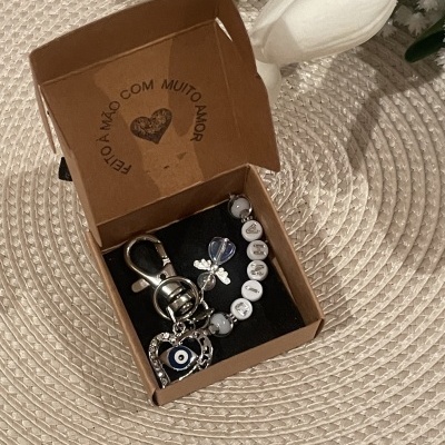 • Chaveiro com contas e pingentes dentro de caixa de cartão aberta num tapete bege trançado