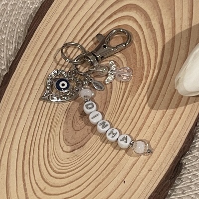 • Chaveiro com olho turco, contas brancas com letras DIANA e figura de cristal sobre madeira clara.