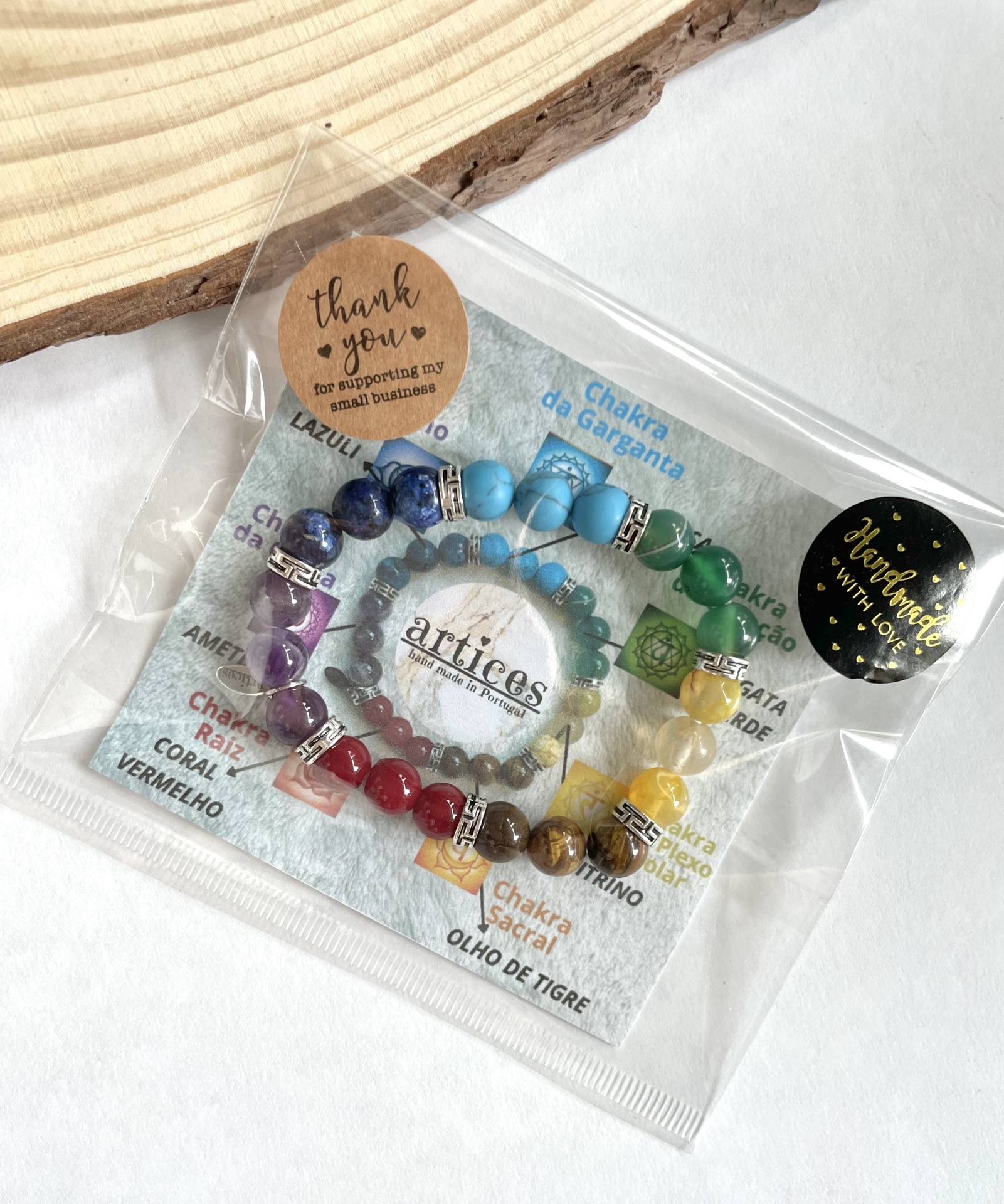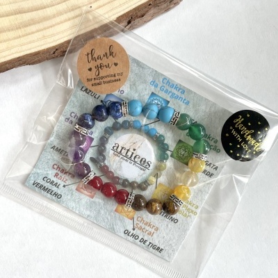 • Pulseira de chakras colorida em embalagem transparente com etiquetas