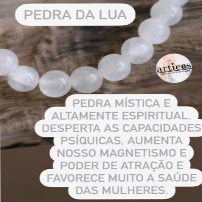 • Colar de pedra da lua com texto explicativo em português e logótipo artices