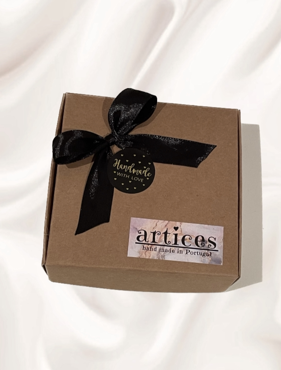 • Caixa de presente castanha com fita preta e etiquetas, sobre tecido branco.