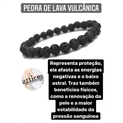• Pulseira de contas pretas porosas feitas de pedra de lava vulcânica, com texto explicativo em português e logo articos.