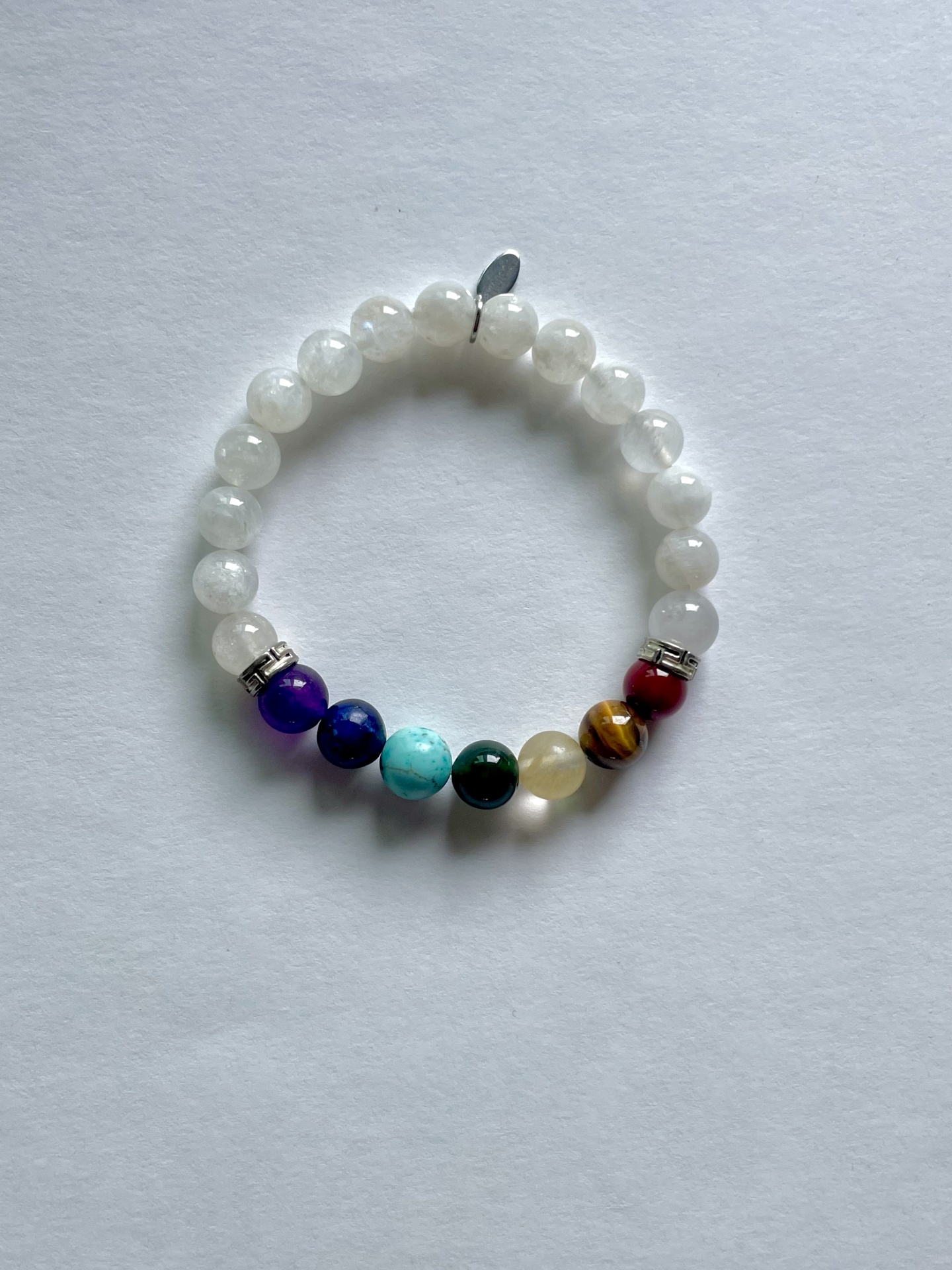 Pulseira colorida de chakra com pedras naturais em fundo branco e logo Artiees