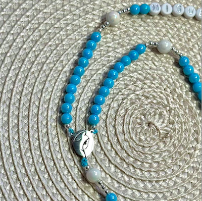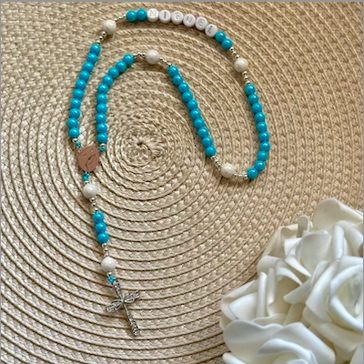 • Terço azul turquesa e branco com crucifixo prateado sobre pano cinza com padrão floral