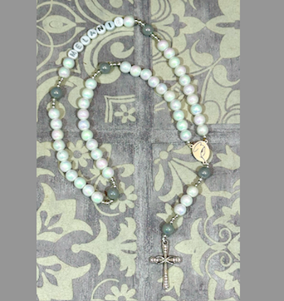 • Terço de pérolas brancas e contas cinza com cruz metálica