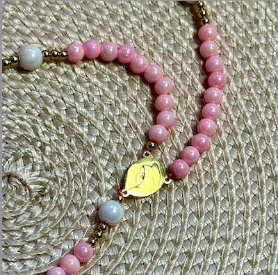 • Colar de contas rosa e dourado com medalha dourada e desenho de lábios em tecido de palha