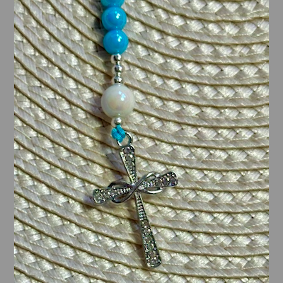 • Colar de contas azuis com pendente cruz prateada e fundo trançado