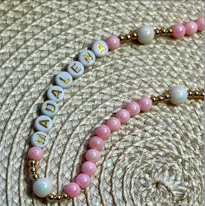 • Colar de contas rosa e dourado com nome MADALENA em letras brancas preto