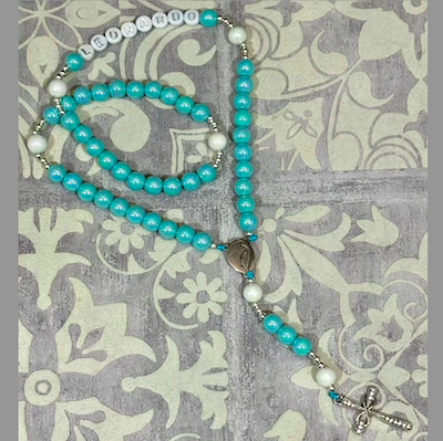 Terço personalizado com peças em aço inoxidável, em prateado ou dourado e cruz com pedras Strauss.